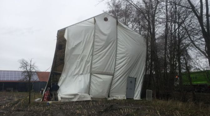 Het weer werkt goed mee en we volgen de aanwijzingen van onze deskundige vriend zo goed mogelijk op. Eerst het grondzeil. Oh nee, eerst het zeil onder het grondzeil. Op twee pallets is de hele bestelling van de kampeerwinkel torenhoog opgestapeld. Een beetje beteuterd staan we er naar te kijken. ‘Geef maar een schaar,’ zegt de vriendin. Voor we er erg in hebben is ze driftig aan het knippen om de zwarte afdekfolie los te krijgen. De ene doos na de andere wordt aan de kant gezet om uiteindelijk een pakketje te vinden dat wel eens het onderzeil zou kunnen zijn. Alleen….. het is zo dun…… nou ja, niet op letten, gewoon doorgaan….. We spreiden het plasticje over de grond. Tenminste, dat proberen we. De wind blaast het steeds omhoog en van meerdere kanten klinken kreten. ‘Gooi er wat op, zo gaat het niet, pak die dozen om de hoeken te fixeren.’ We liggen zo’n beetje over het zeil heen te dweilen en proberen het in toom te houden, terwijl de vriendin ons de pakketjes toewerpt. Het begint langzaam in te scheuren en we hebben handen en voeten tekort om het geheel op de plek te houden…. Met de moed der wanhoop proberen we te redden wat er te redden valt.